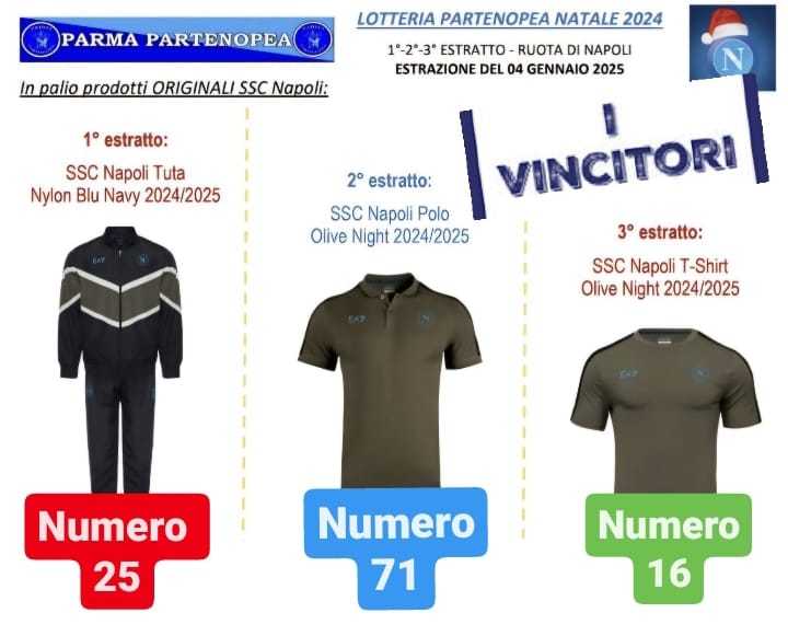 Parma Partenopea: 9° Lotteria Partenopea i VINCITORI della Tuta,Polo e T-Shirt Ufficiale Originale EA7 SSC Napoli 2024/2025