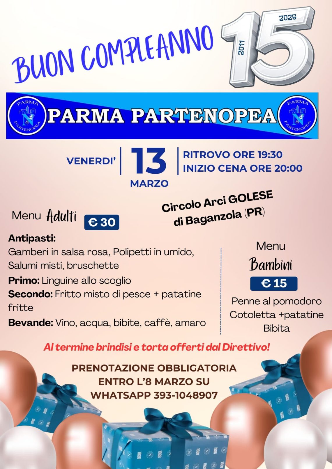 Venerdì 13 Marzo 2026 alle Ore 19:30 presso il Circolo Arci Golese Baganzola in occasione del suo 15° Compleanno